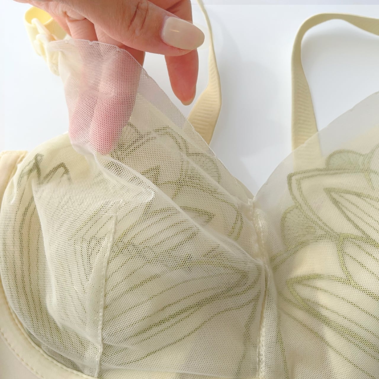 透け感がほどよいセクシーさを演出しつつ、バスト全体をやさしく包み込むカップが安心感を与えてくれる、絶妙なバランスの一枚です。