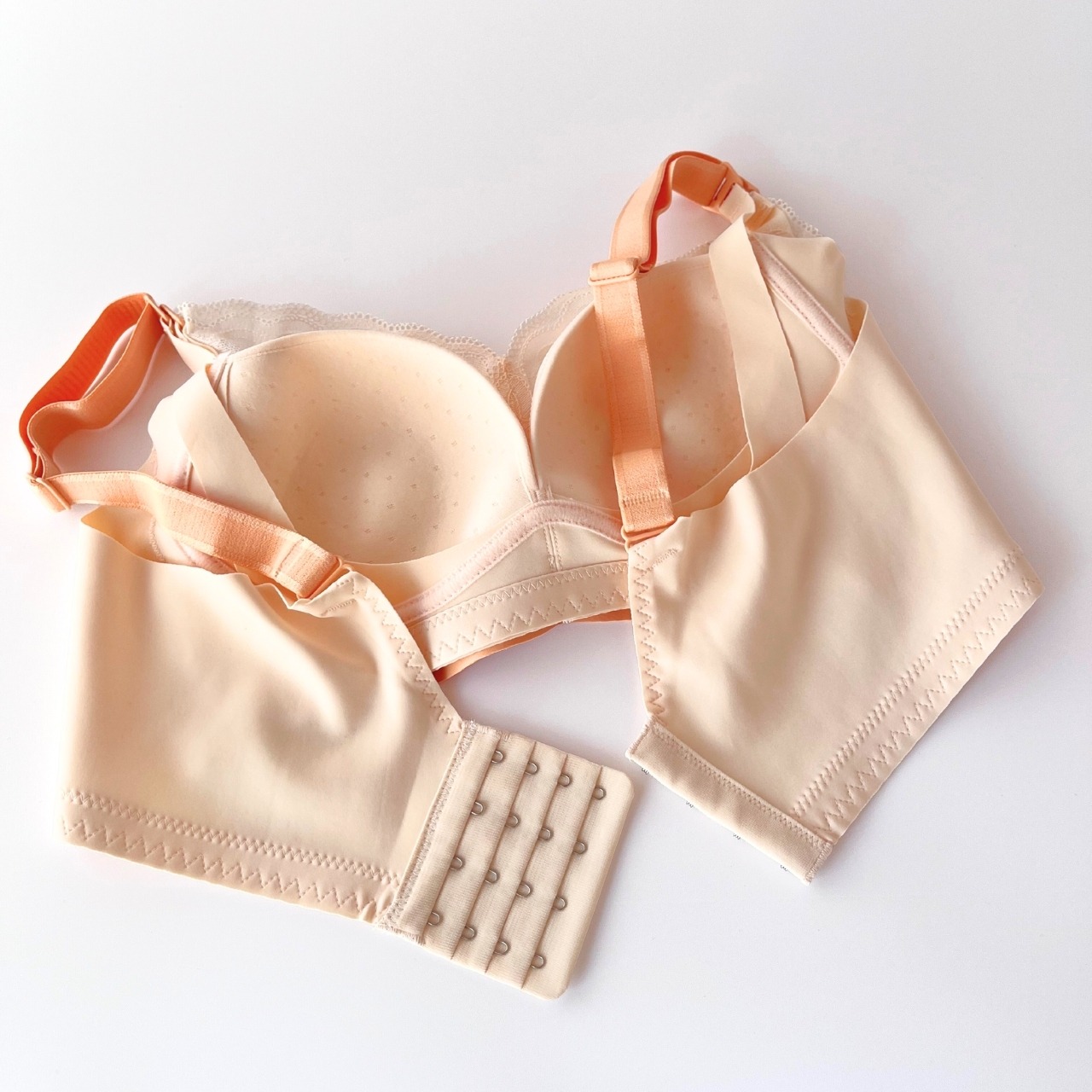 サイドボーン不使用のやさしい着心地。脇高設計とバスト上部まで包み込むシルエットで、サイドボーンがなくても安心感とほどよいホールド感を実感できます。